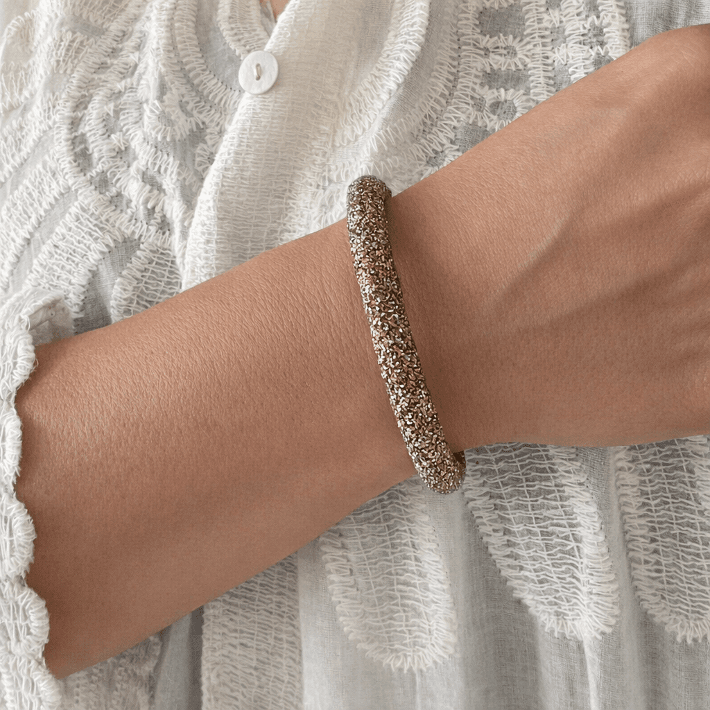 Les bracelets faits artisanalement avec un soin tout particulier, sont sublimés par une délicate finition dorée, témoignant du savoir-faire minutieux derrière chaque pièce unique. Coloré à la main grâce à une fusion artisanale de lumière et de couleur.