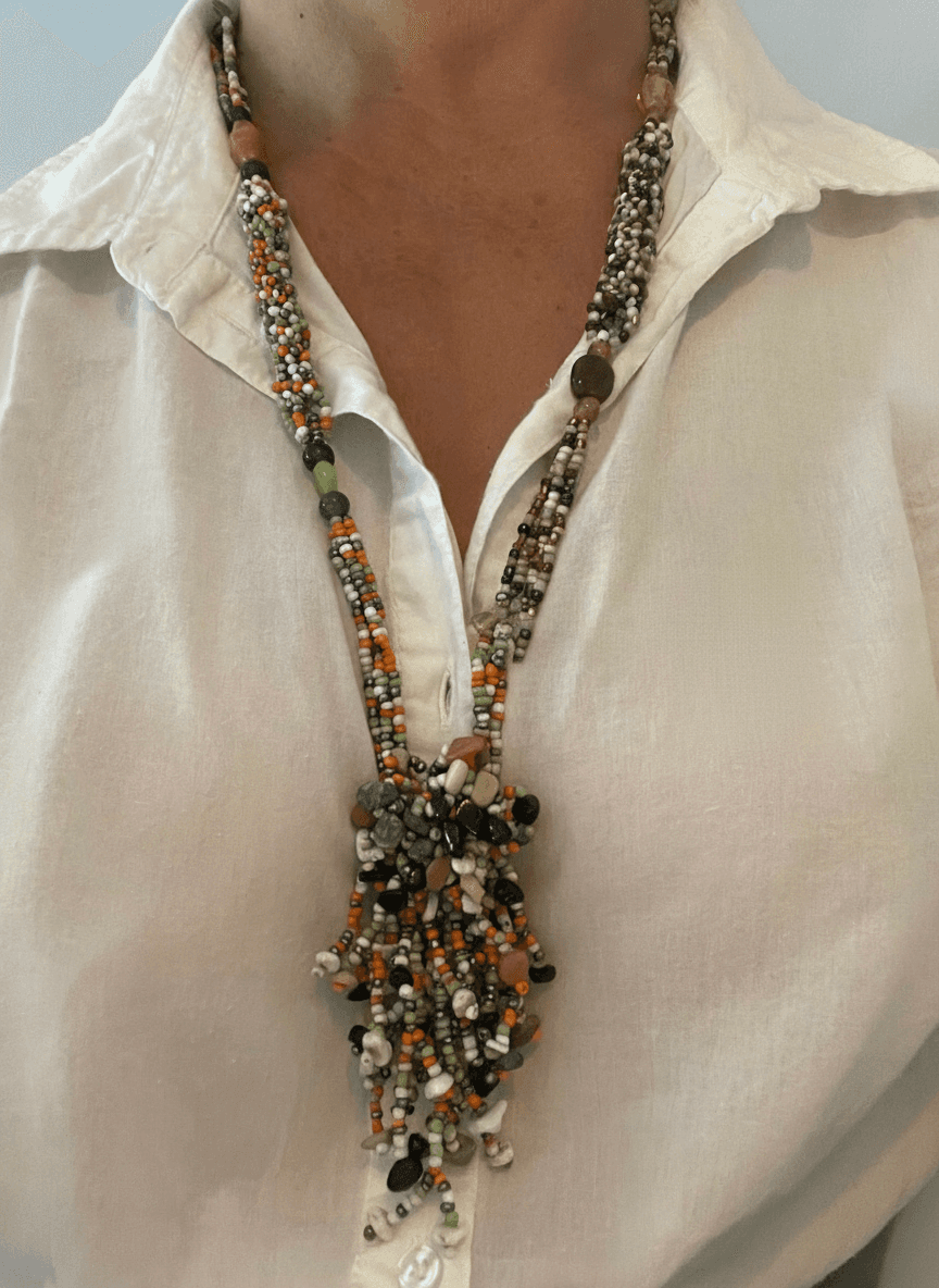 Ces colliers sont composés de perles en verre minutieusement tissées, associées à des éclats de pierres naturelles pour leur qualité. Leur design vibrant et original apporte une touche ethnique et chaleureuse à toutes vos tenues