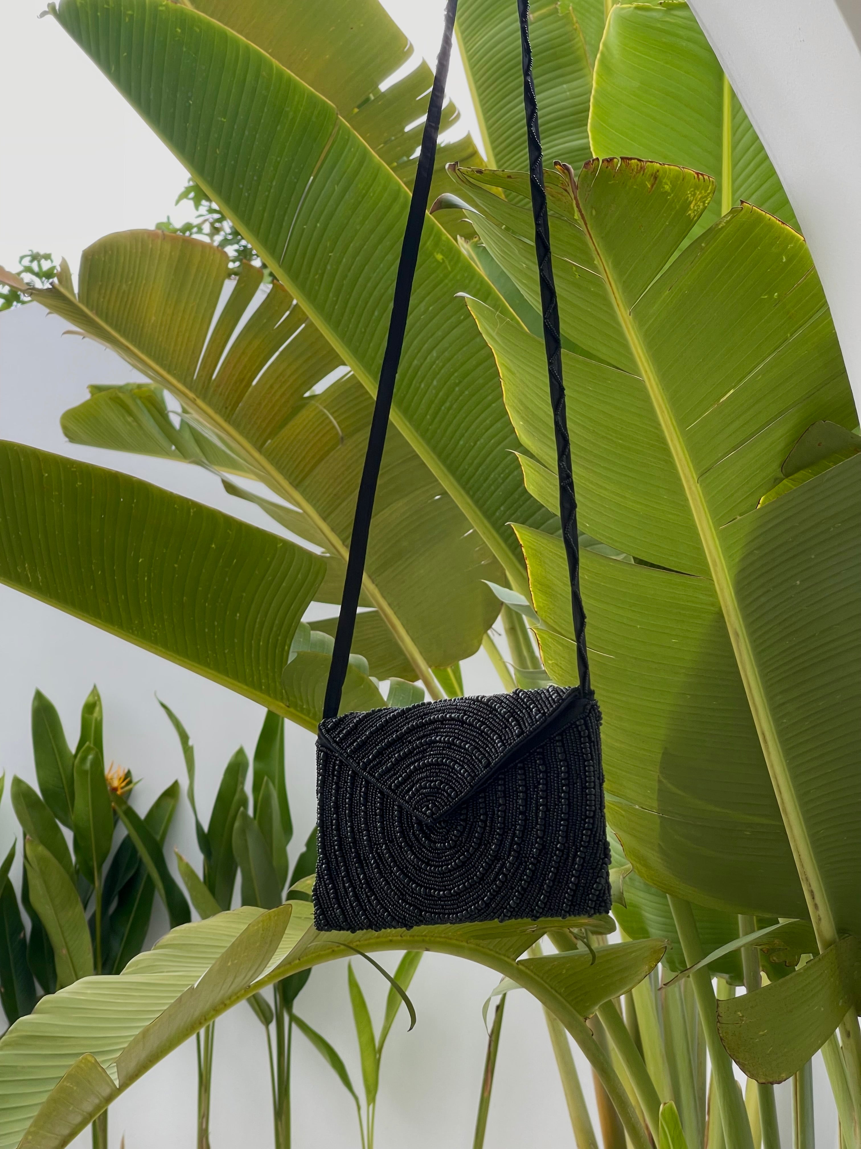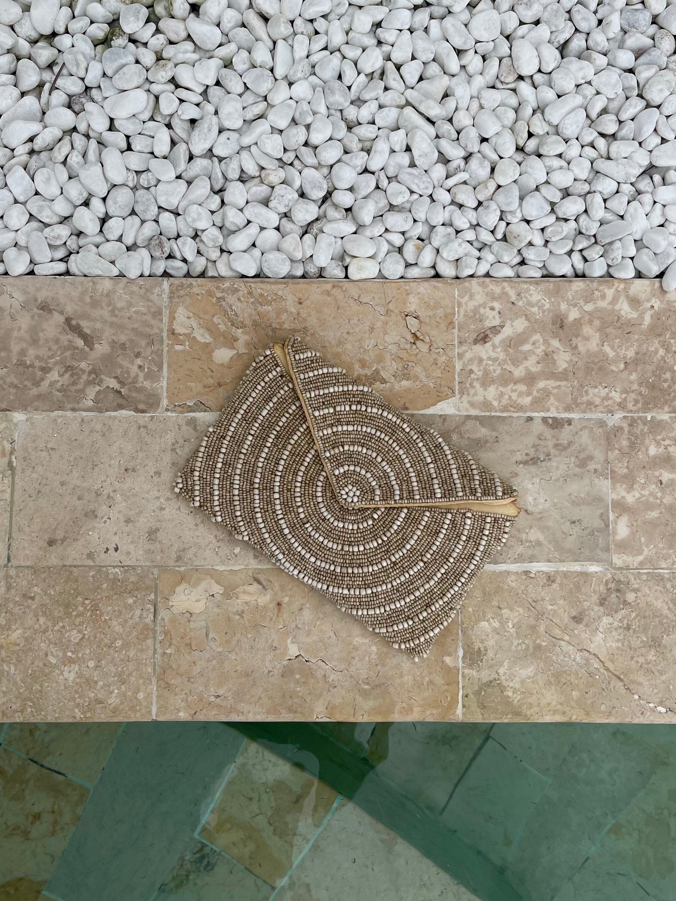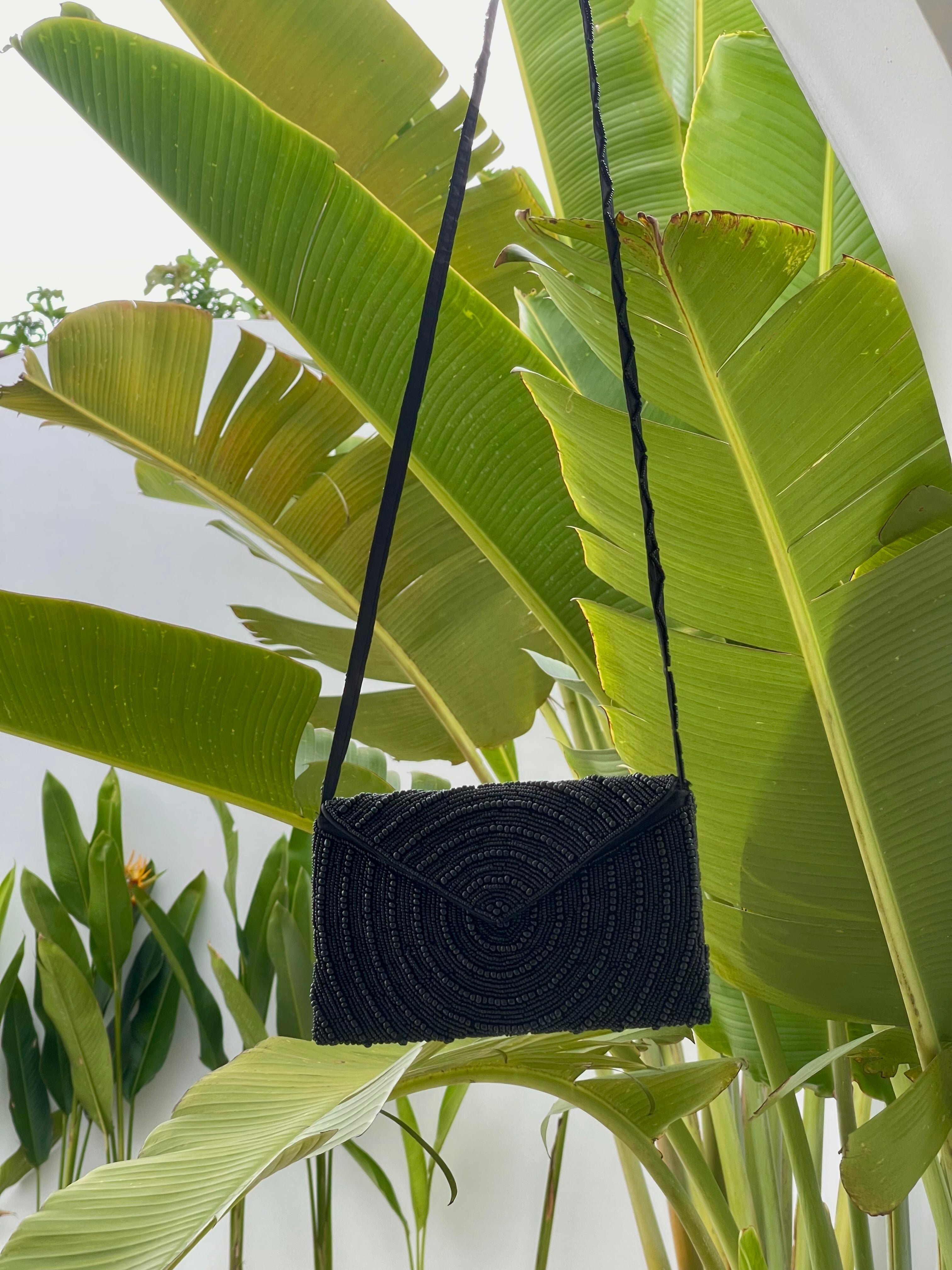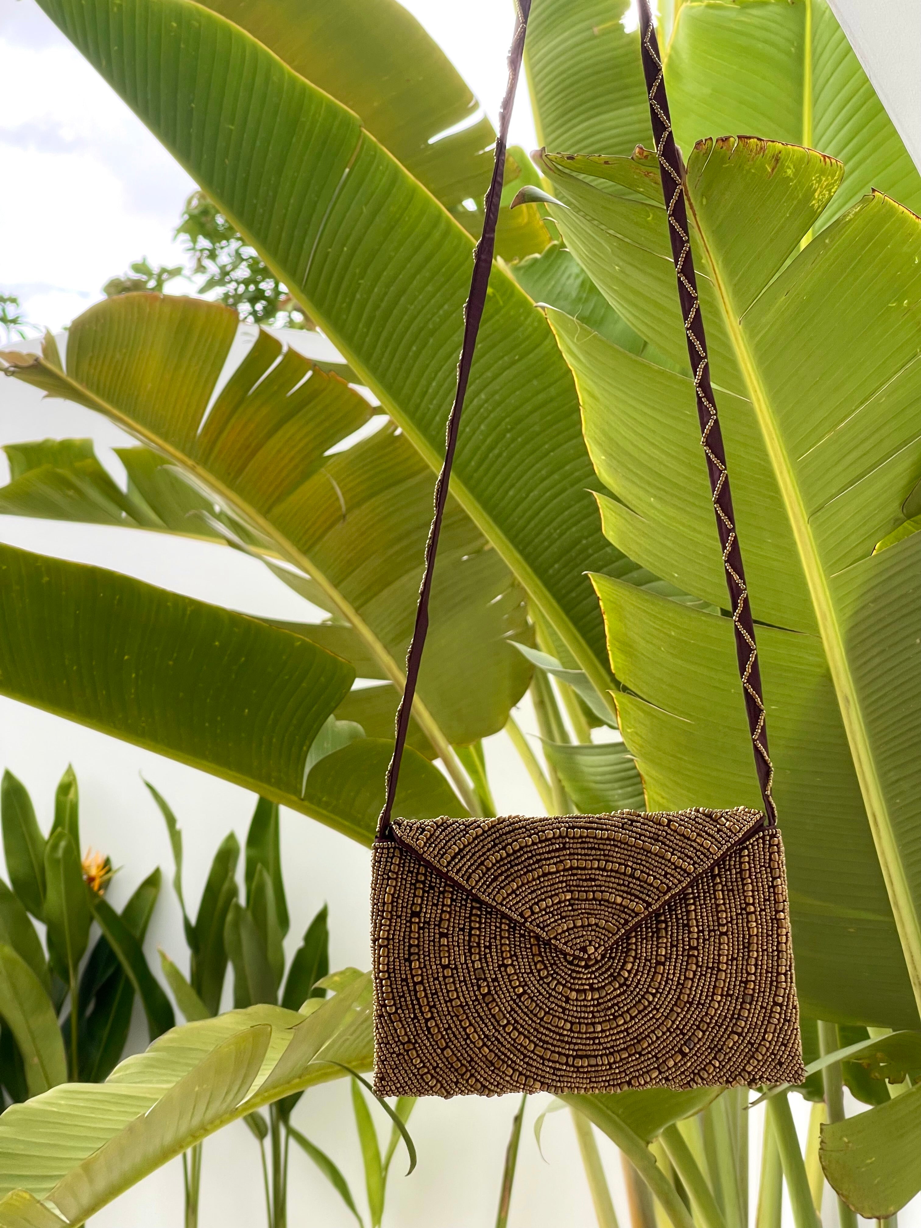 Ce sac artisanal allie élégance et raffinement grâce à sa broderie de perles de verre doré disposé en un motif mandala lumineux . Avec sa forme enveloppe et sa anse discrète légèrement perlée, il se porte aussi bien à la main qu'à l'épaule. l'accessoire idéal pour sublimer vos tenues de soirée, vos cérémonies ou vos looks bohème chic. Existe en 3 coloris, noir naturel et doré.